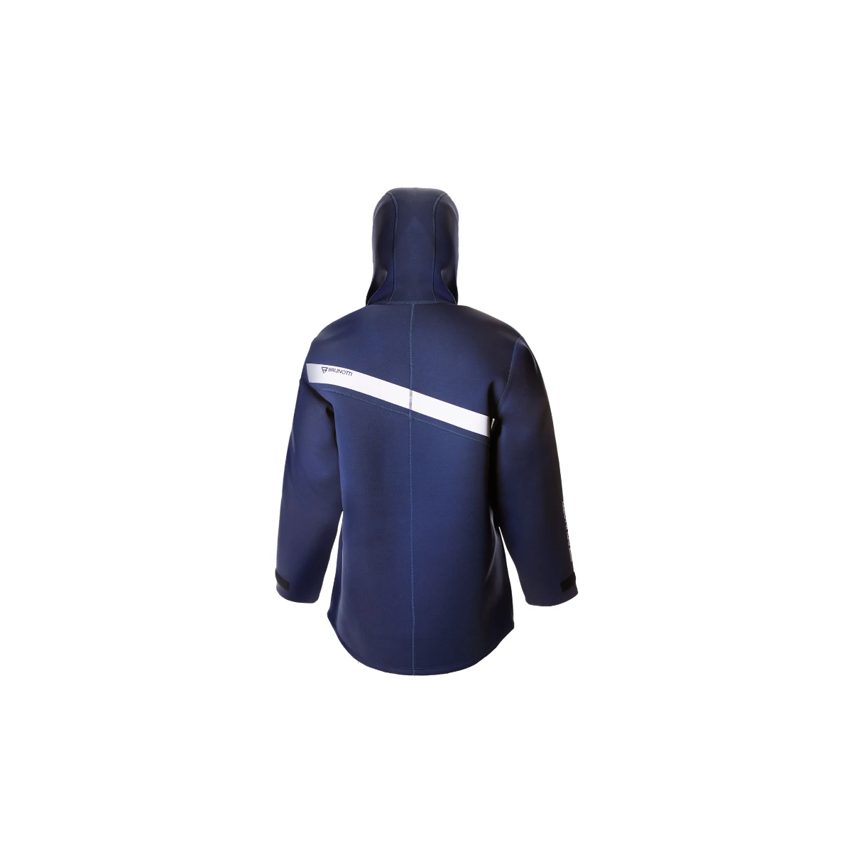Neopren overtræksjakke til at bære over våddragten. Simple lommer og med en hue, der kan reguleres.