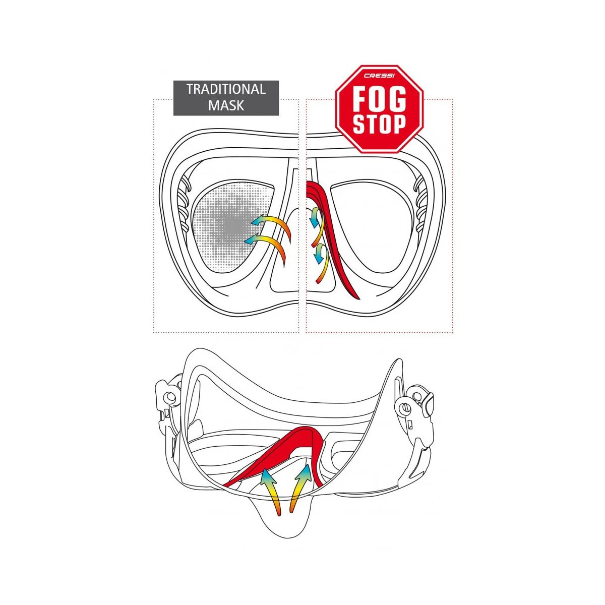 ZEUS har en række tekniske fordele, som Cressi har indarbejdet i denne maske. De kombinerer en fantastisk teknologi med et fedt design. Den eksklusive maske integrerer rammen i underdelen i stedet for at overlappe dem. Dette eksklusive byggesystem, der tillader montage uden lim, reducerer tykkelsen til et absolut minimum, hvilket forbedrer den indre volumen, synlighed og tilpasning af masken til ansigtet. Desuden reducerer den sin vægt til 125g og giver masken strukturelle stivhed i en traditionel maske, men med fordelene ved en rammeløs maske. Det forbedrer også maskens vandtæthed, eliminerer enhver mulighed for irriterende kontakt mellem rammen og panden.